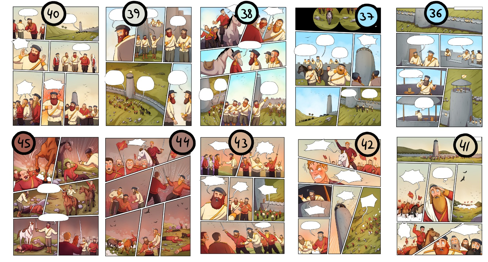 עשרה עמודים של סצנת קרב מתפתחת- השמים משתנים בהתאם להתרחשות.